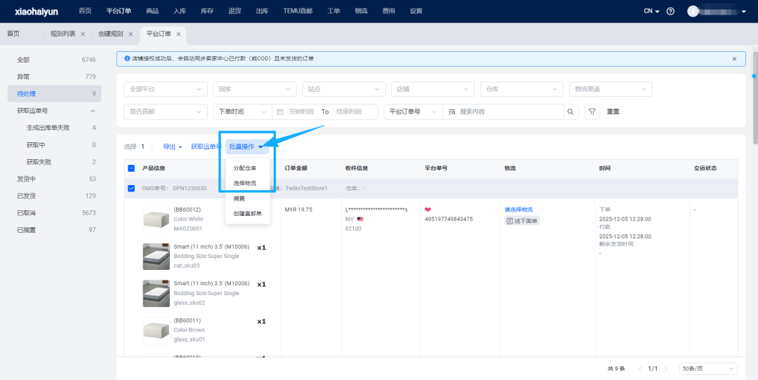 遇到定制单或者突发紧急订单,需优先分配特定仓库加急处理。这时可直接在极风系统选择订单进行 “分配仓库”,手动选择最近的、有货的仓库,10 秒就能完成分仓,订单直接同步至目标仓库立马安排发货,应对突发需求快准稳,卖家体验感拉满。