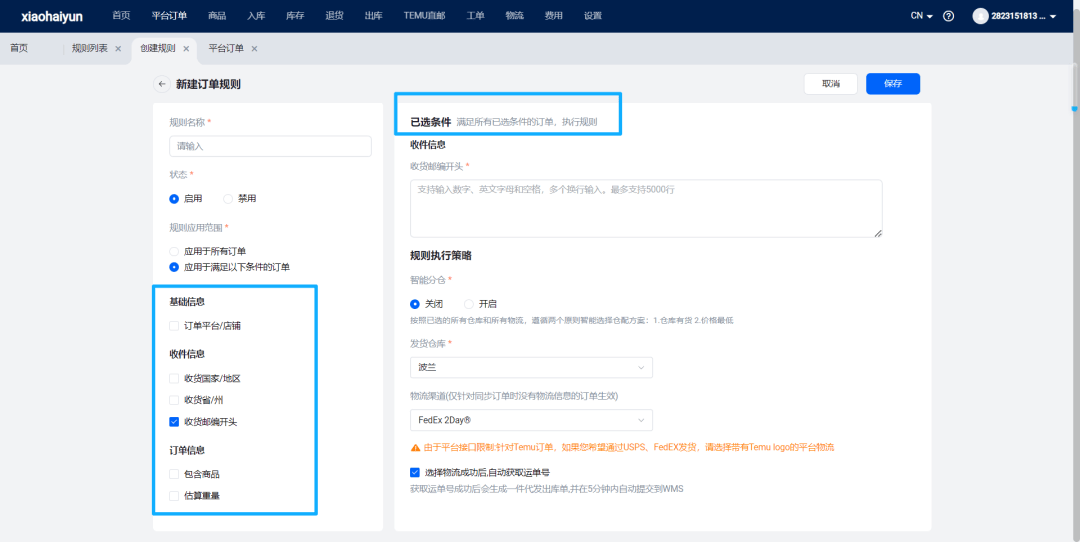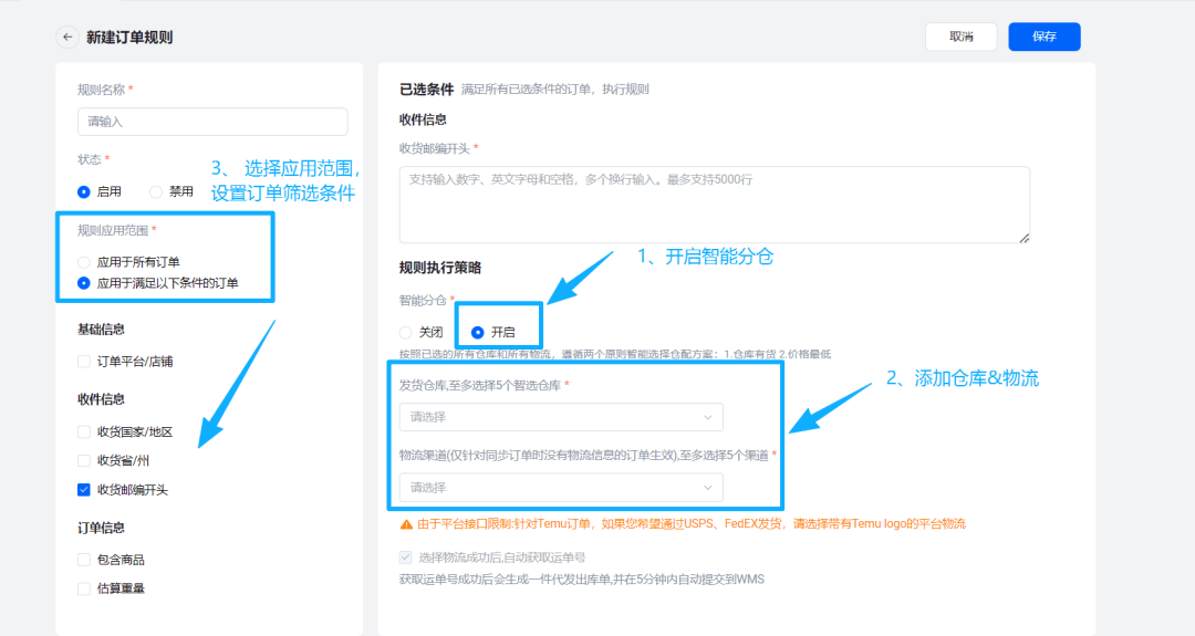 日常订单有固定分仓逻辑,无需反复人工判断。比如 “某平台的美国订单统一发美西仓”或想“按邮编就近分配仓库”。对于这种常规订单,可以在极风系统创建分仓规则,按平台、国家、邮编、商品等条件设定,自动匹配指定仓库与物流。设置一次就能永久生效,不用反复手动操作。