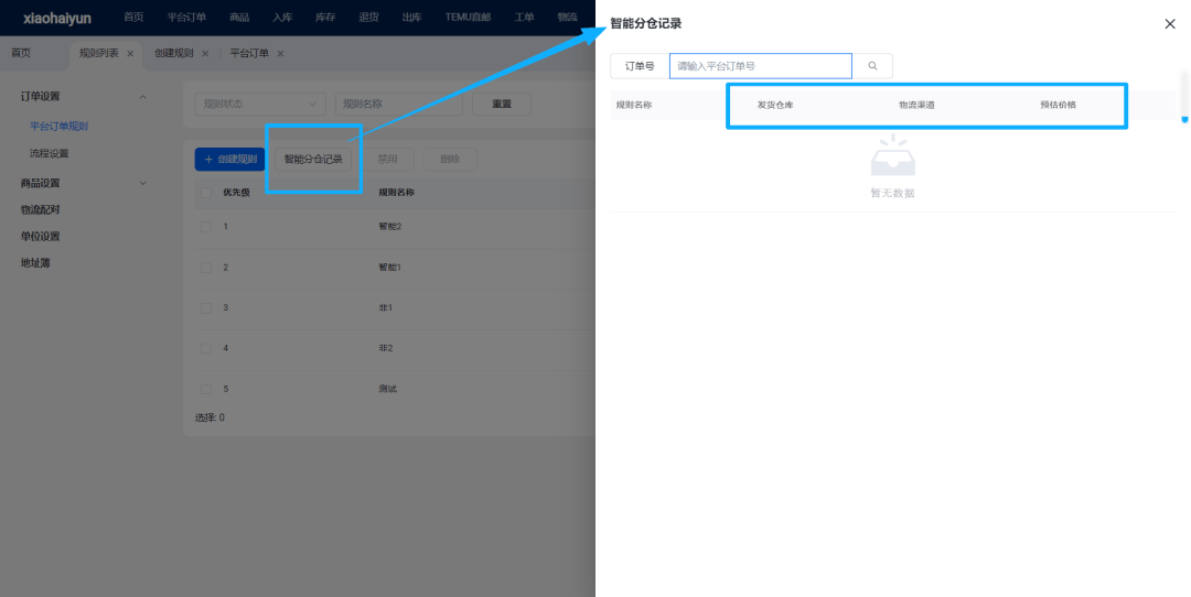 系统还能实现分仓链路可视化。每笔订单的分仓规则、发货仓库、物流渠道、预估成本都清晰记录,在“智能分仓记录”里随时查,对账和问题追溯一目了然。