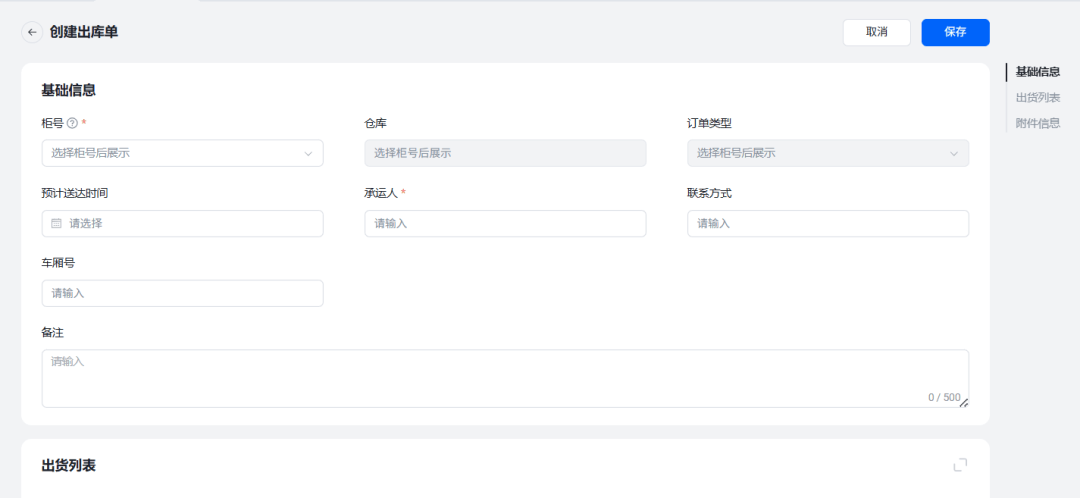 ① 1分钟即可创建整柜出库单,勾选对应柜号,系统自动关联该柜货物信息;