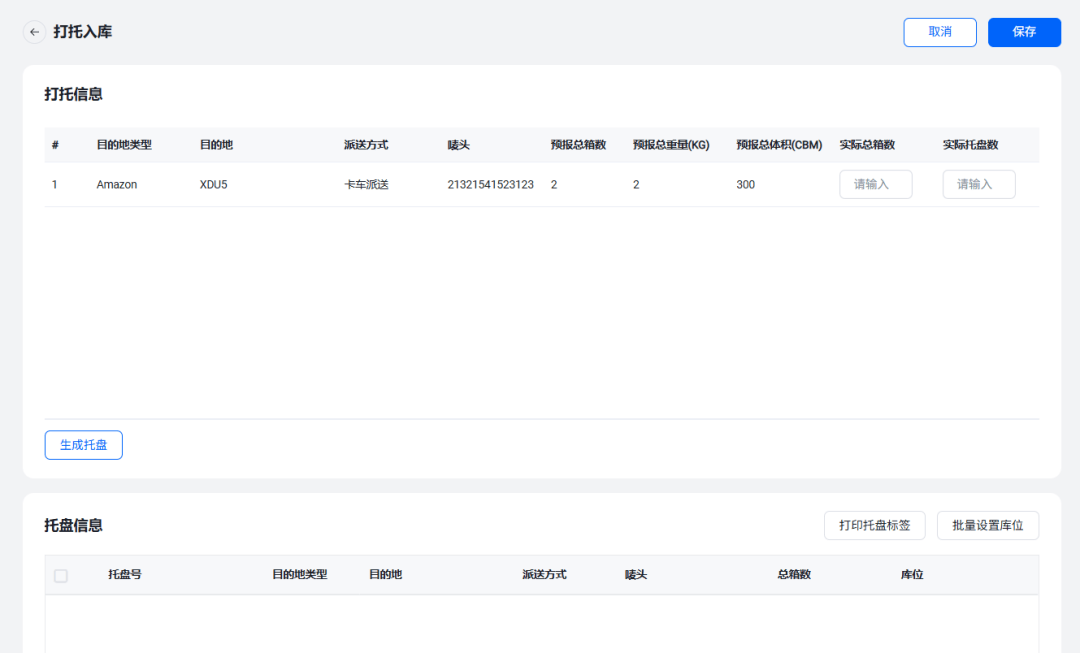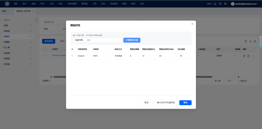 依托系统预估打托功能,货柜到港前就能精准测算各FBA仓的预估托盘数——输入货物总方数后,即可自动计算预估托盘数量,基于这些数据提前拿约备约,牢牢锁定时效,加快安排节奏!