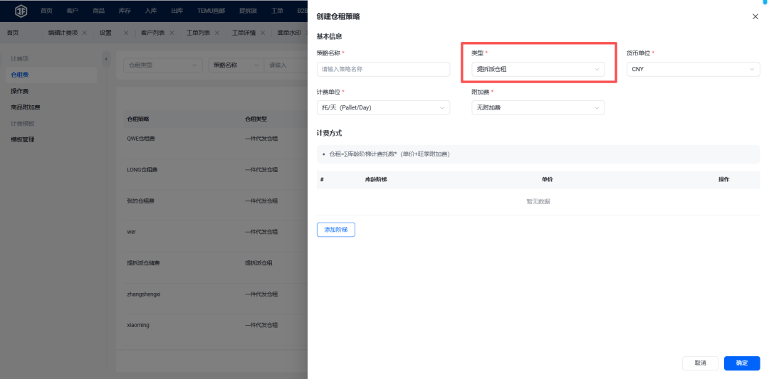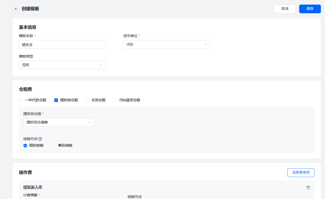 支持创建客户专属计费模板,可批量关联预设的仓租费、操作费等费用项与对应计费策略。给客户开户时直接分配模板,后续产生提拆派订单后,系统自动按规则核算费用,无需重复设置,既提升内部管理效率,也让客户对费用清晰放心,减少合作争议。