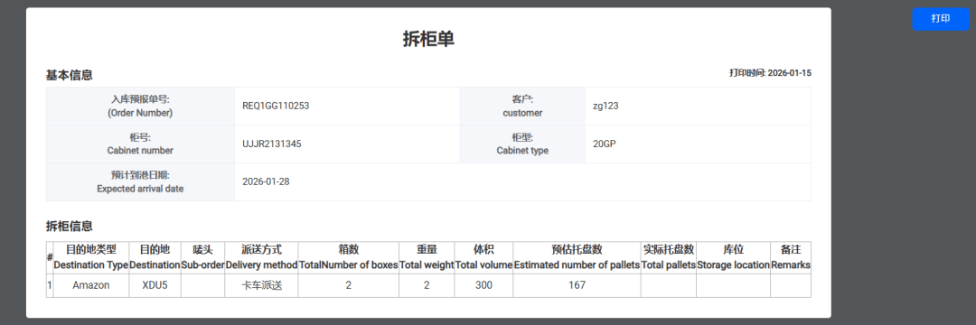 系统可直接生成和打印标注清晰的拆柜单,柜号、目的地、预估托盘数等关键信息一目了然。仓管按单拆柜后,直接贴上提前准备的托盘标签,完美避开货物混淆、托盘数错乱、漏清点等问题。