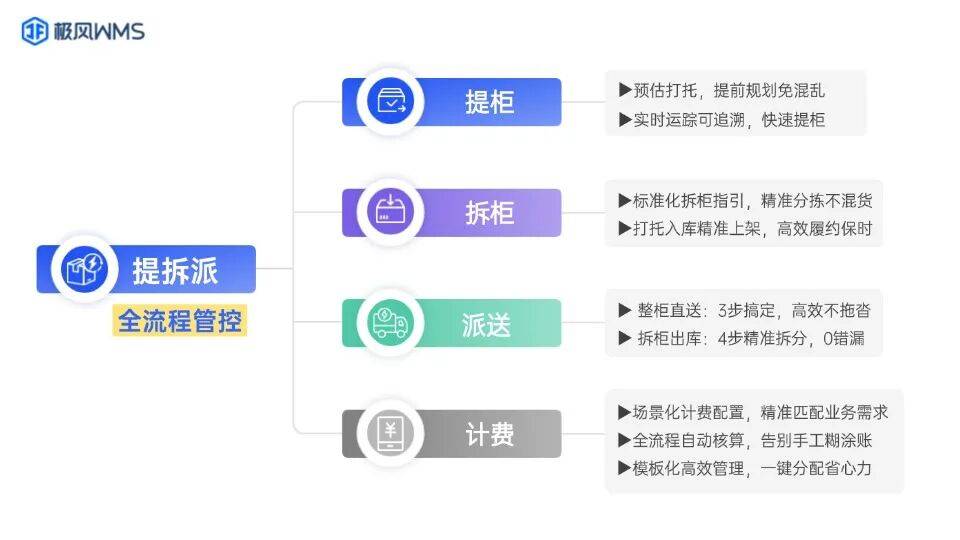 但想吃到这块红利,关键就在于实现提拆派全流程的标准化、可视化、精准化。极风WMS【提拆派】新功能模块,正好把这三点拉满!提柜、拆柜、派送、计费全流程管控,把模糊的进度变成实时可视化轨迹,把繁琐的计费变成精准化自动核算,让提拆派从“烫手山芋”变成“赚钱利器”!
