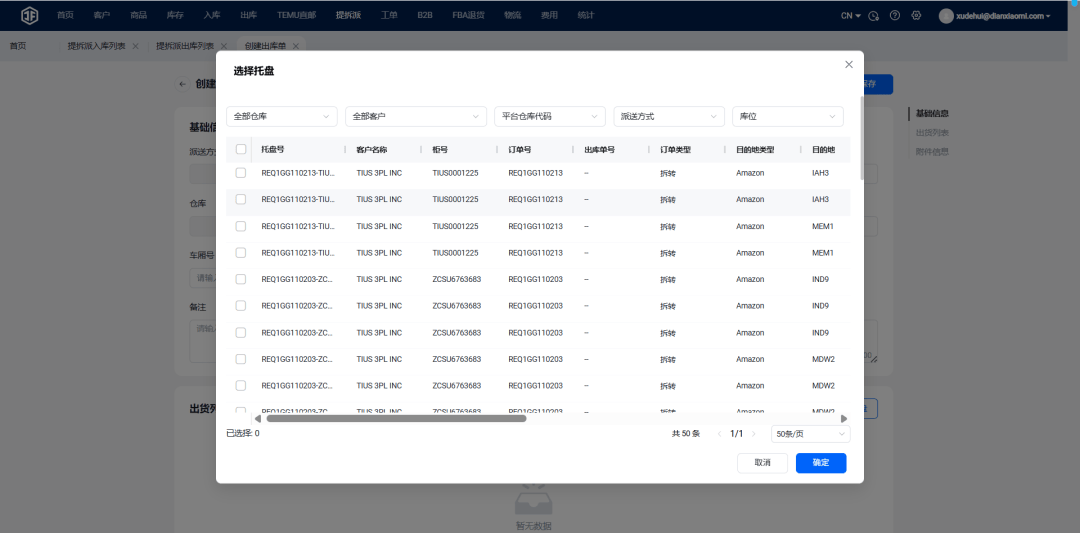 ①1分钟创建拆柜出库单,可按客户、平台仓库、派送方式或货架位精准筛选需出库托盘,避免拿错货物;